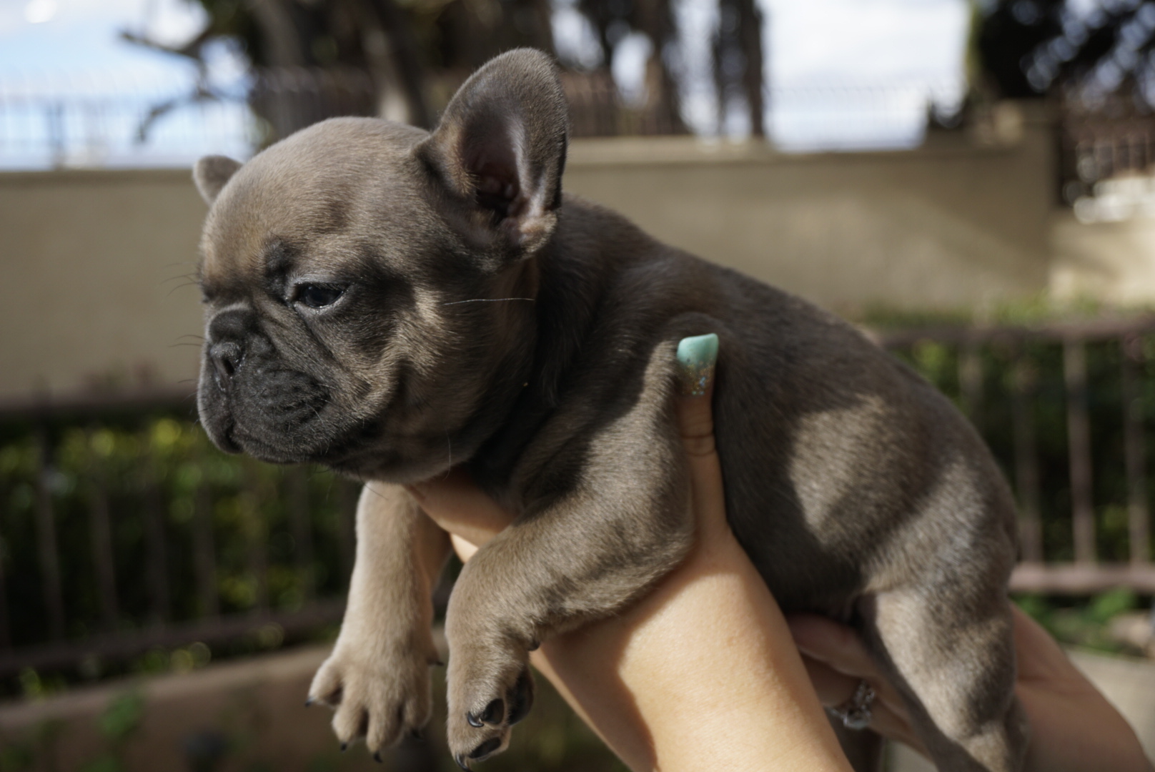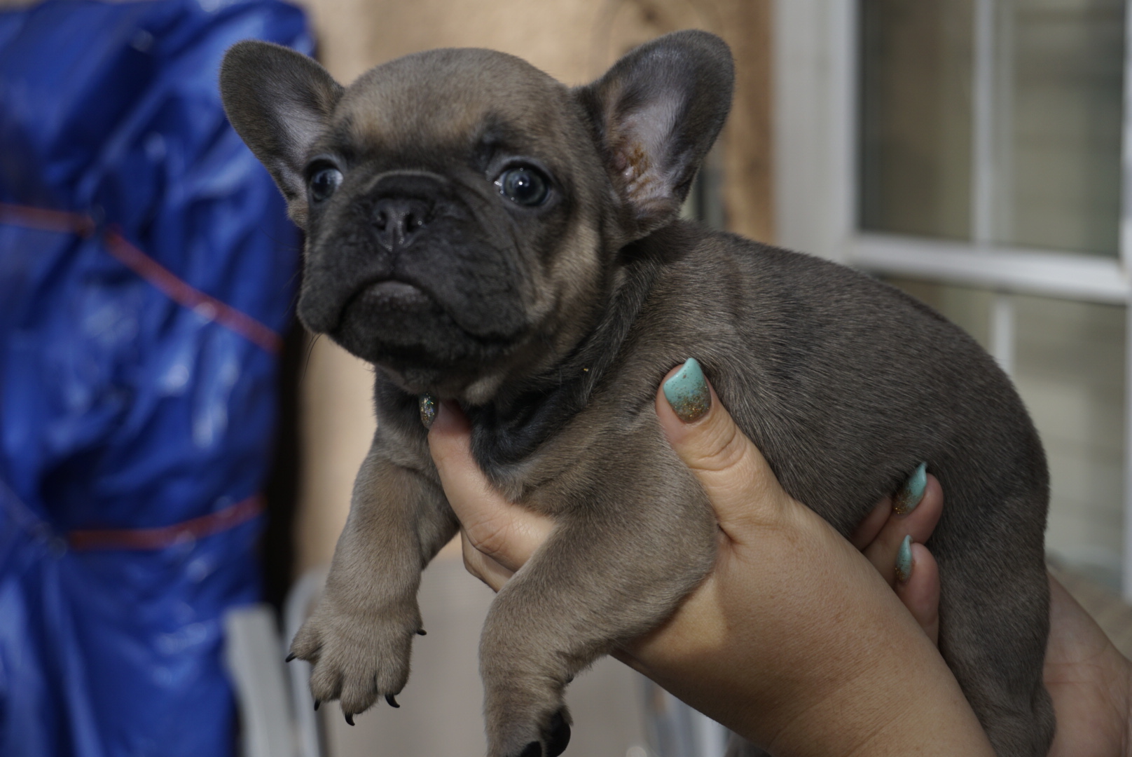 Ava is a blue fawn French Bulldog Puppy from our previous litter of Rossi Testarossa and Weeman from the Dank Line. She went home with the beautiful couple to Northern California with a new friend – a handsome pug!